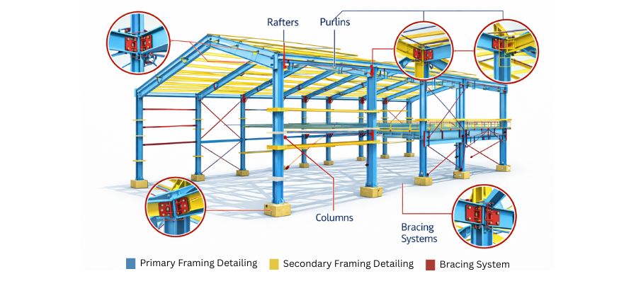 We offer end-to-end detailing and engineering services for Pre-Engineered Steel Buildings, including: